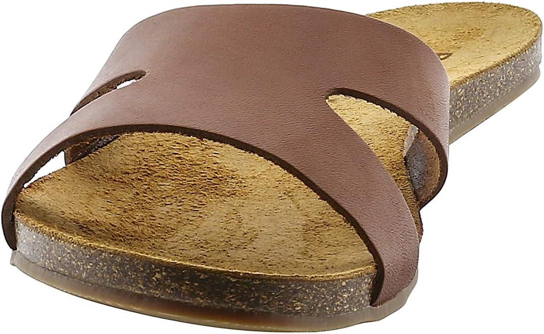 Single leather strap sandal with a flat cork rubber outsole for maximum cushioning, with a soft leather footbed and a thin, rubberised outsole.